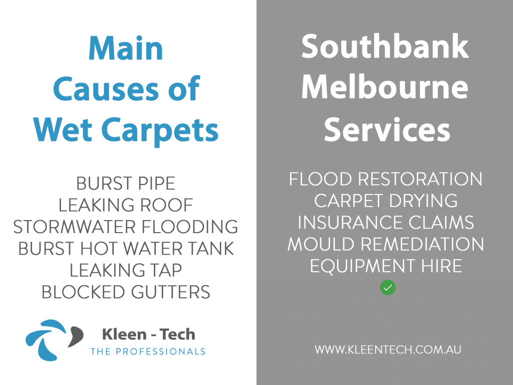 If you’ve entered your home, office or warehouse to find there has been unexpected flooding or water damage resulting in wet carpets in Southbank Melbourne, call the experts now on 1300 30 50 30 any time of the day, any day of the year. We understand why a flooded premises can be a shock and we’ll ensure that we work with you, insurance companies and all other parties involved throughout the remediation works. Importantly we’ll find the best solution for you and take the stress away. Sometimes insurance companies can take time to send out specialists following flooding resulting in further damage to your property and increased wait times. We can cut out the wait times and provide a solution that will benefit you financially so that you can be stress-free. Call Kleen-Tech to discuss your options on 1300 30 50 30.